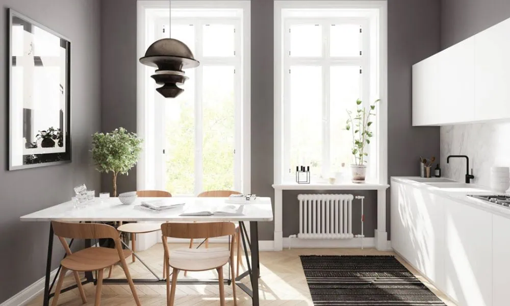 Een lichte, luchtige uitstraling bereik je met pasteltinten, wit of lichtgrijs op de muren en meubels. Voeg eventueel een spiegel toe om optisch meer ruimte te creëren en licht te reflecteren. Kies daarnaast voor warme verlichting met dimbare hanglampen of wandlampen: sfeervol, functioneel en perfect om de kleine eethoek groter te laten lijken.