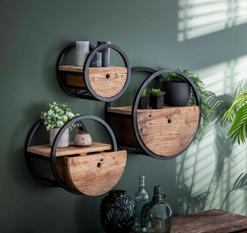 Je muren zijn er nu eenmaal. Gebruik ze zo veel mogelijk om opbergruimte te creëren, ook daar waar je geen industriële kasten kunt plaatsen. Ga voor veel industriële wandplanken en maak er bijvoorbeeld een mooie collage van. Zo heb je meteen veel ruimte voor je boeken, je servies of gewoon om je mooie vakantiesouvenirs een plek te geven. Kies voor smalle hoge kasten tegen je muur in plaats van brede lage kasten. Zwevende kasten of een kapstok die aan de muur hangt creëren een groter ruimtegevoel. Hoe meer je je vloer namelijk ziet doorlopen, hoe groter de kamer lijkt. En waarom zou je bijvoorbeeld je fiets niet aan de muur hangen als decoratief element? Hang in de keuken je keukengerei zoals kookpotten, spatels en lepels aan de muur of zelfs aan het plafond.