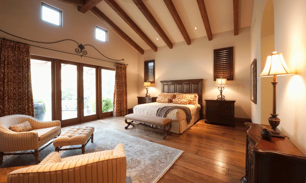 In de slaapkamer draait alles om comfort en rust. Kies voor een houten bedframe en linnen beddengoed in zachte, neutrale kleuren. Voeg een groot wollen kleed toe aan het voeteneind en gebruik houten nachtkastjes en een eenvoudige, maar stijlvolle lamp. Houd de decoratie eenvoudig en natuurlijk, met bijvoorbeeld een paar mooie foto’s in houten lijsten en een paar planten.