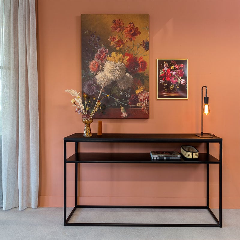 Een sidetable achter je bank, of ze nu tegen de muur staat of niet, is net als een vitrinekast. Laat er geen ‘rommel’ op slingeren, maar hou het netjes. We gaven je hierboven al een tip hoe je spulletjes uit het oog kan onttrekken. Hou de planken die je wél kunt zien netjes op orde. Plaats er ook niet té veel objecten op. Je sidetable is nog altijd een volwaardig meubel dat gezien mag worden. Door ze overdacht te decoreren, komt je sidetable nog veel beter tot zijn recht.