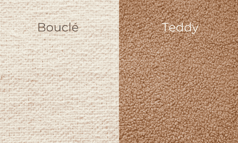 2. Materiaal: Teddy stof wordt meestal gemaakt van polyester, terwijl bouclé stof gemaakt kan worden van verschillende garensoorten zoals wol, katoen of een mix daarvan.