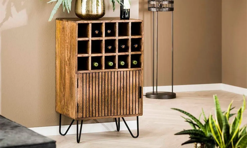 Mangohout staat bekend om zijn warme kleur en bijzondere nerf. Een mangohout wijnkast voegt direct karakter toe aan een kamer. Het is stevig en duurzaam, wat betekent dat je kast lang meegaat. Vooral in een landelijke, bohemian of industriële stijl is mangohout een populaire keuze.