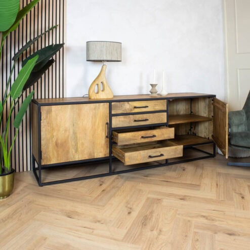 Onze industriële mangohouten dressoirs stralen pure stoerheid uit, perfect voor wie een krachtig statement in huis wil maken. De combinatie van mangohout en zwart metaal geeft elk dressoir een robuuste uitstraling die niet te missen is. Of je nu kiest voor metalen kastdeuren of lades met een industrieel randje, de verhouding tussen hout en metaal bepaalt de sfeer in je interieur. Ga je voor een dressoir met een visgraatmotief en een zwarte afwerking? Of spreekt de combinatie van grof mangohout en strak metaal je meer aan? De details maken het verschil. Denk aan de keuze van handgrepen: van minimalistisch en modern tot robuust en opvallend, ze geven jouw kast de finishing touch die het helemaal afmaakt.