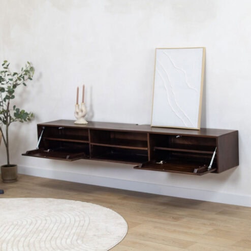 Of je moet kiezen voor een lage, een lange, een smalle of juist een grote tv kast ligt heel erg aan de ruimte waarin je de industriële tv kast wilt plaatsen. Houd altijd in je achterhoofd dat het mooi is om wat extra ruimte rondom de tv kast over te houden zodat het de eyecatcher is en blijft. Meet ook op hoe groot je televisie is. Je wil natuurlijk niet dat de tv uitsteekt voorbij de kast. Bekijk daarom vooraf goed de afmetingen en kies op basis daarvan een mooie passende kast met planken in enkelvoud of meervoud.