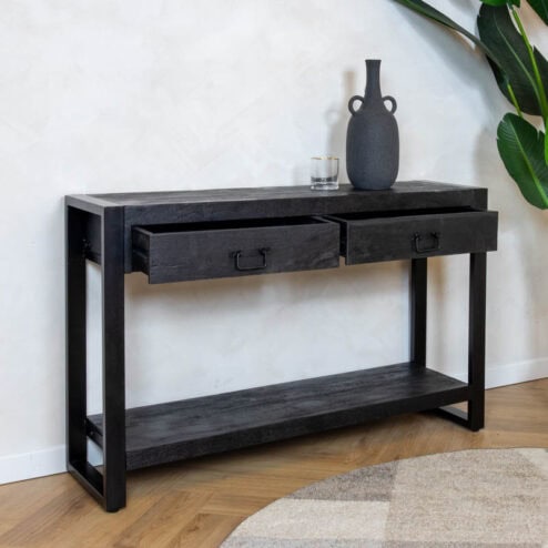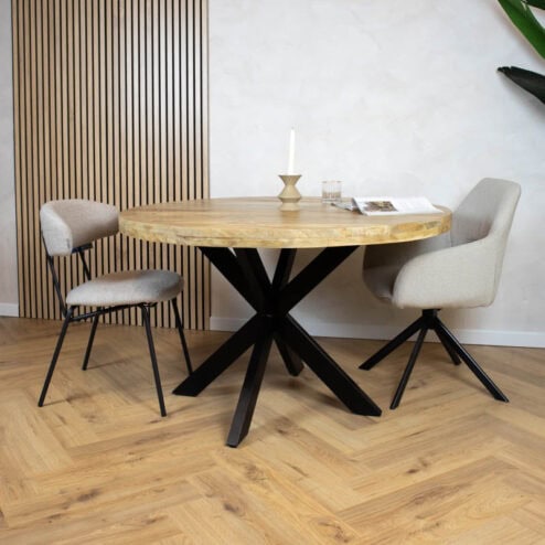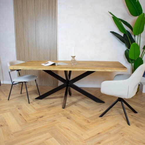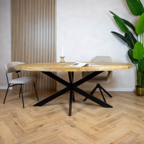 Een robuuste houten tafel is de perfecte eyecatcher in een ruimte. Dit kan een eettafel zijn of een salontafel in de woonkamer, een vergadertafel in een meeting room of een bijzettafeltje in het salon. Het robuuste uiterlijk van de houten tafel kan gecreëerd worden door verschillende elementen. We denken dan in de eerste plaats de onbewerkte, ruwe materialen die worden gebruikt voor de constructie van de tafel, al dan niet te bestellen in combinatie met een stalen onderstel. Een industriële tafel moet niet per se van massief hout zijn: ook dikte van het tafelblad bepaalt de look van de robuuste houten tafel.
