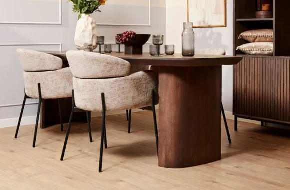 Elke woonstijl vraagt om andere meubels. In een Scandinavische eetkamer zie je lichte houtsoorten, eenvoudige vormen en ingetogen kleuren. Denk aan een slanke houten tafel, stoelen met afgeronde vormen en veel natuurlijke lichtinval.