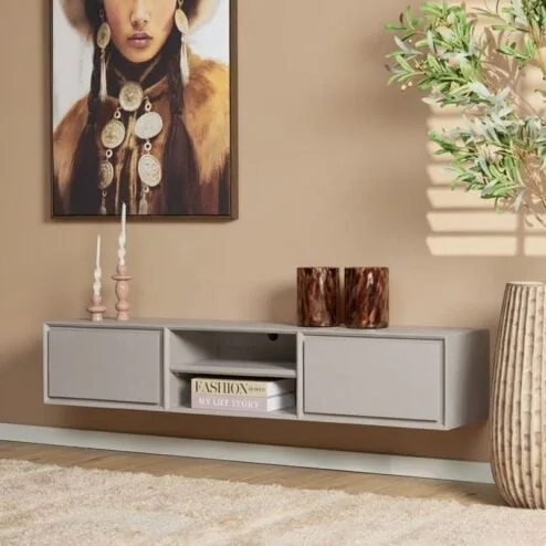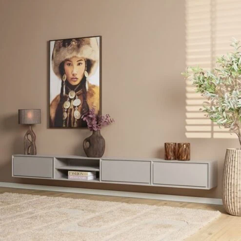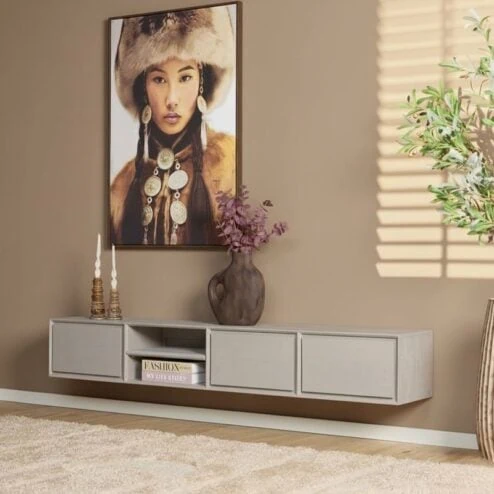 De kleuren zijn neutraal, zoals lichte houttinten en natuurlijke kleuren. Subtiele texturen maken de kast visueel interessant, zonder te veel af te leiden. Typische materialen zijn hout, metaal, rotan of MDF met houtnerf.
