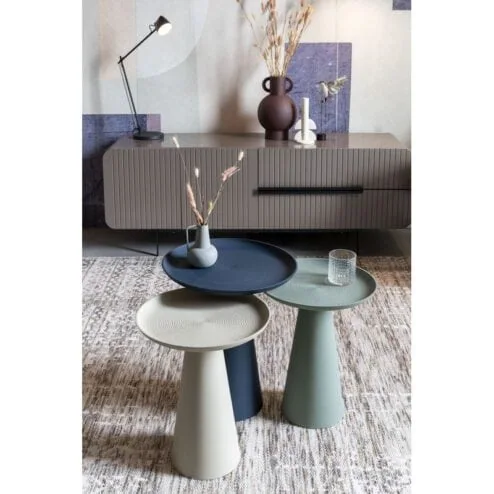 De Ringar bijzettafels zijn moderne en speelse accenten voor in huis. Verkrijgbaar in blauw, roze en beige, en in diverse maten, voegen ze kleur en stijl toe aan je interieur. De strakke ronde vorm en het metalen materiaal maken deze tafels zowel functioneel als decoratief. Ideaal als bijzettafel naast de bank, als plantentafel of als nachtkastje.