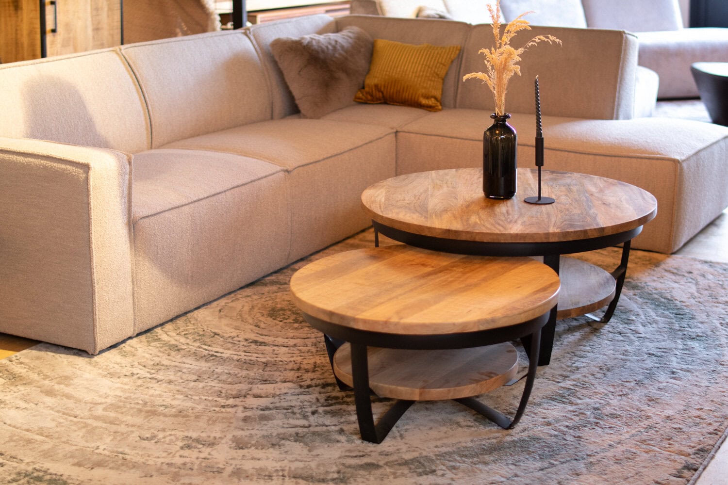 Salontafel Emmy is vervaardigd uit mangohout. Het hout is afgewerkt met een matte lak en het metalen frame met een zwarte lak. Dit model heeft twee tafelbladen op verschillende hoogtes. De salontafel bestaat uit een set van 2. De kleinste tafel heeft een diameter van 70cm en de grootste 90cm. Leuk om ze naast elkaar te zetten, maar ze zijn ook los te verkrijgen. Lees verder voor meer informatie.