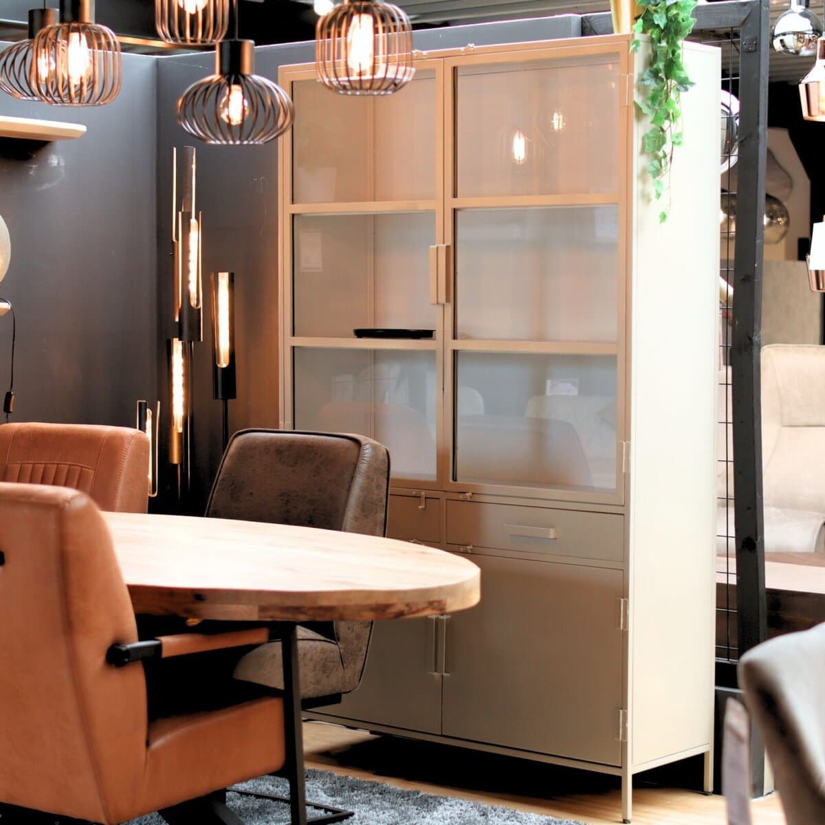 Figue vitrinekast industrieel taupe binnenkant zijkant glas 120cm