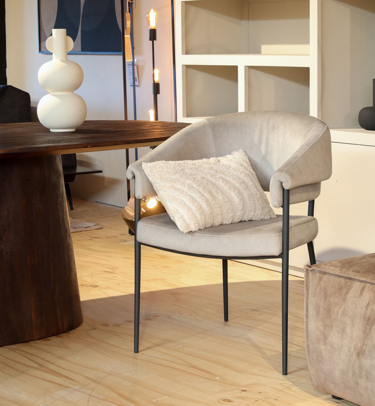 De President Eetkamerstoel in naturel Cosmo velvet biedt een luxueuze en comfortabele zitervaring, perfect voor langdurig gebruik bij elke eettafel.