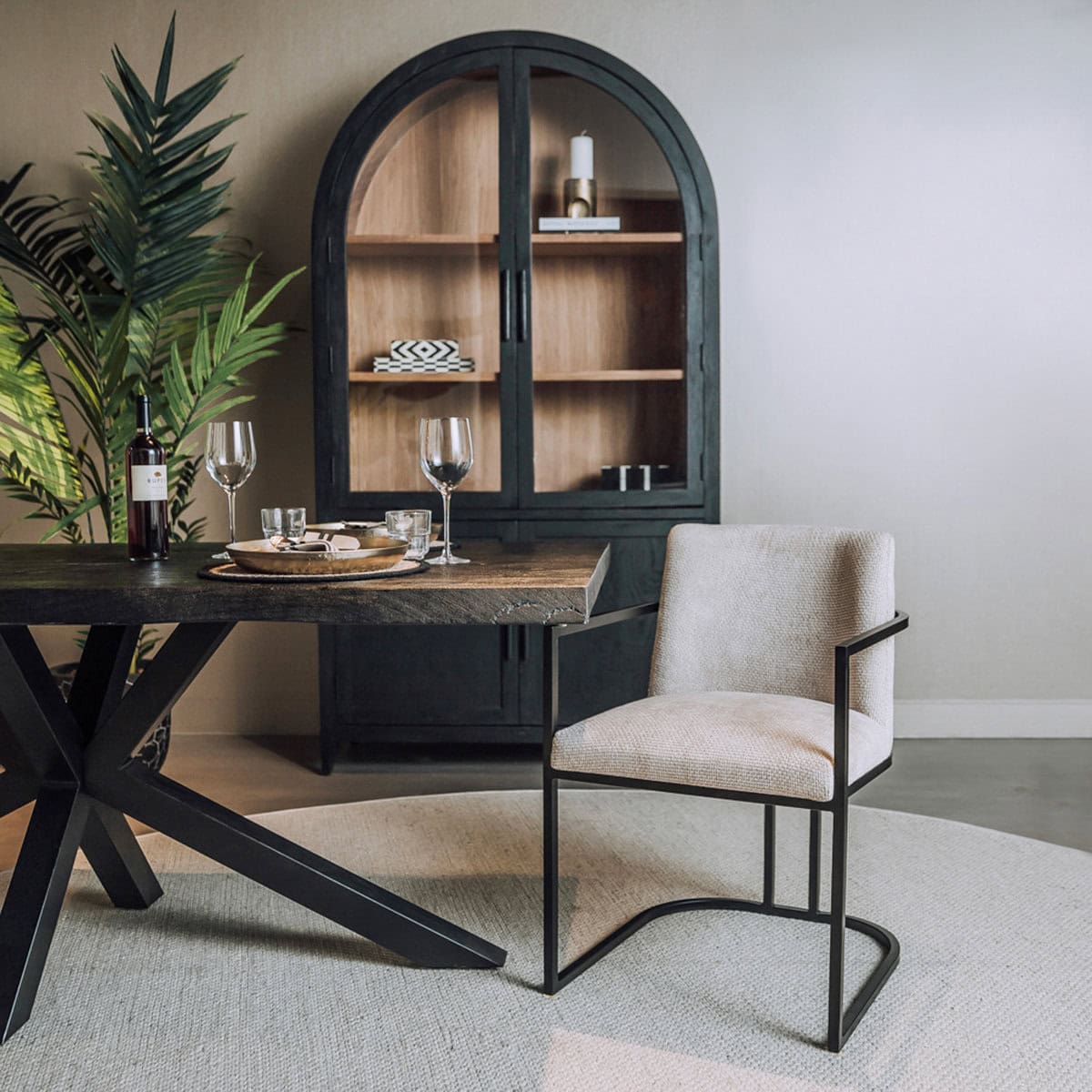 De Rotondi Vitrinekast met 4 deuren in zwart is een elegante en functionele toevoeging aan je interieur. Met een breedte van 120 cm en een hoogte van 220 cm biedt deze vitrinekast voldoende ruimte om al je waardevolle items tentoon te stellen. De combinatie van zwart mangohout en glas zorgt voor een robuuste en moderne uitstraling, perfect voor een eigentijds interieur.